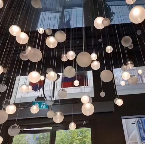 • حتی می‌توان با تنظیم نابرابر آویزها، فرم هنری و پویایی در چیدمان نور ایجاد کرد.