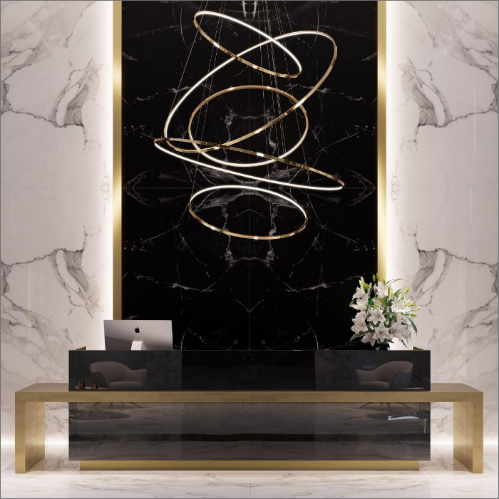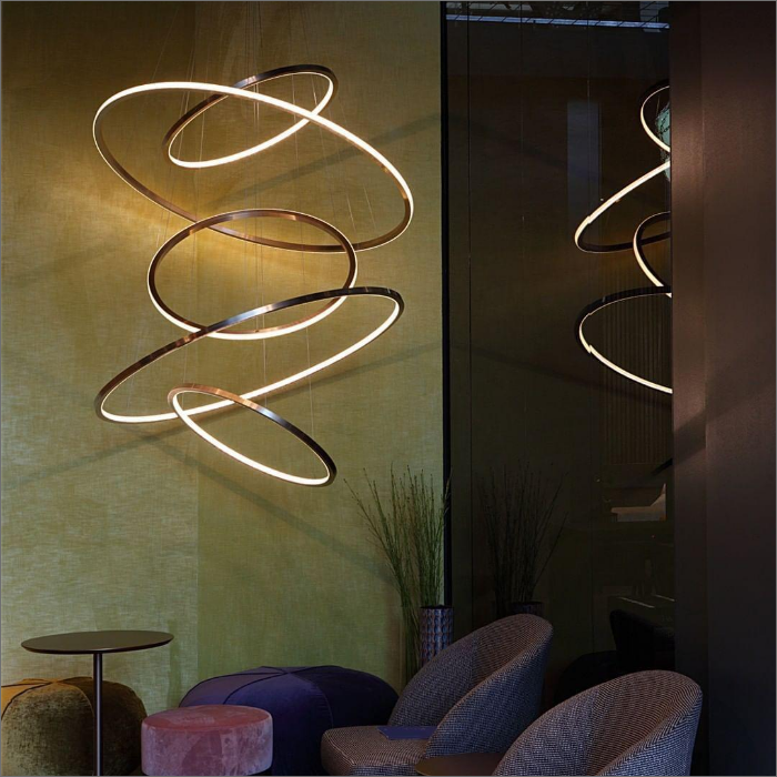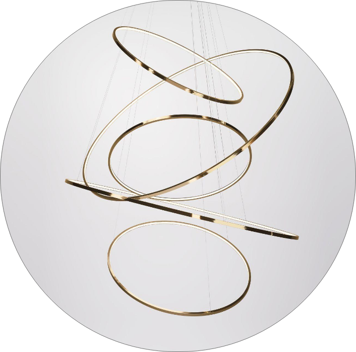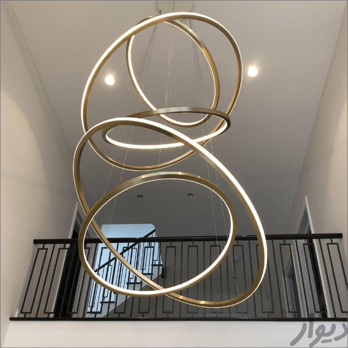 لوستر مدرن حلقه ای ال ای دی 5طبقه زیبا و خاص رنگ نور آفتابی مهتابی یخی میباشد سایز کار یک عدد 30سانت دو عدد50سانت یک عدد 70 سانت ارتفاع از سقف قابل تنظیم ریسه های قابل تنظیم رنگ بدنه کوره ای درجه یک دارای درایورهای ضخیم و مقاوم دهنه کار سیلیکونهای نسوز میباشد.در سه حالت نور به داخل و بیرون یا ترکیبی رنگ بدنه مشکی طلایی