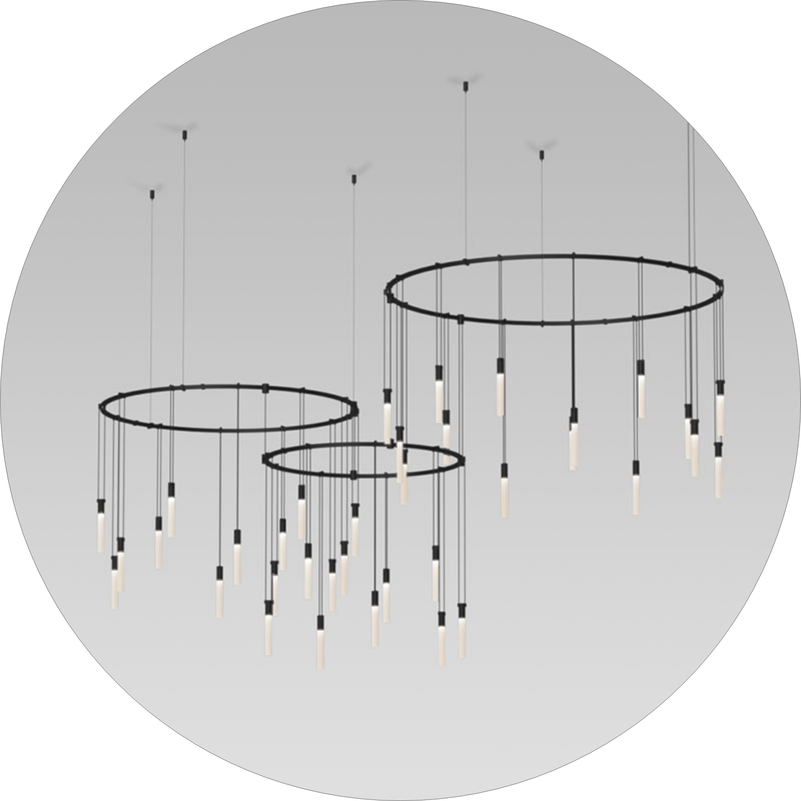 • حتی می‌توان با تنظیم نابرابر آویزها، فرم هنری و پویایی در چیدمان نور ایجاد کرد.