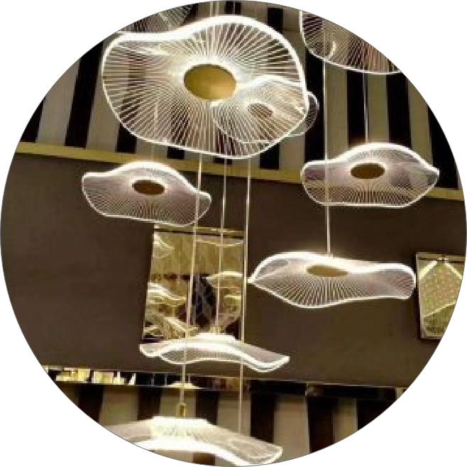 دایره‌های پلکسی دفرمه با انحنای طبیعی و طراحی سه‌بعدی، در کنار نور ملایم LED، فضایی رویایی و آرامش‌بخش ایجاد می‌کنند.