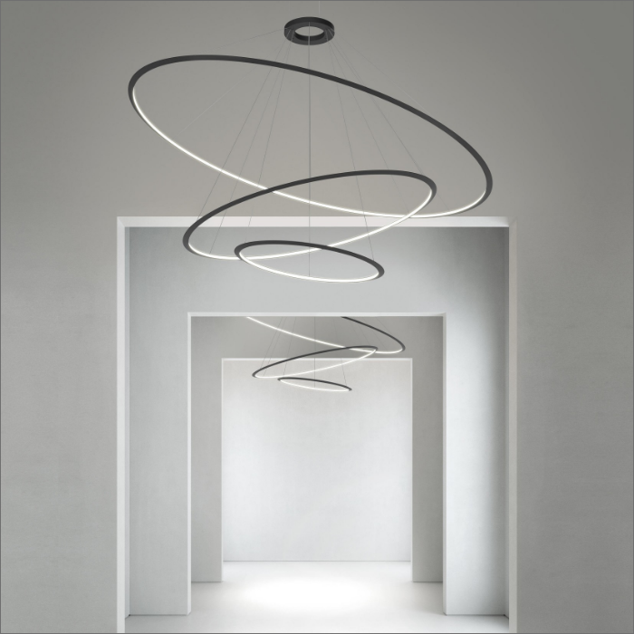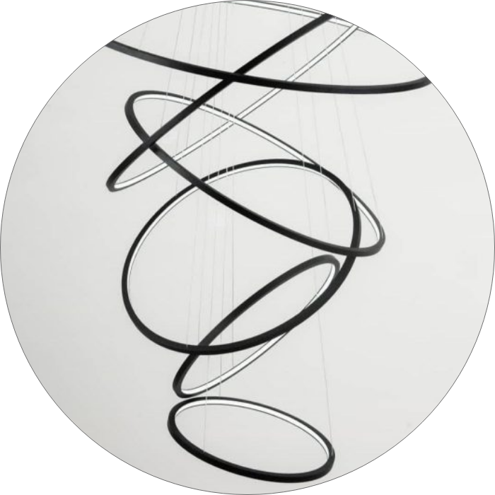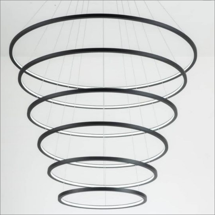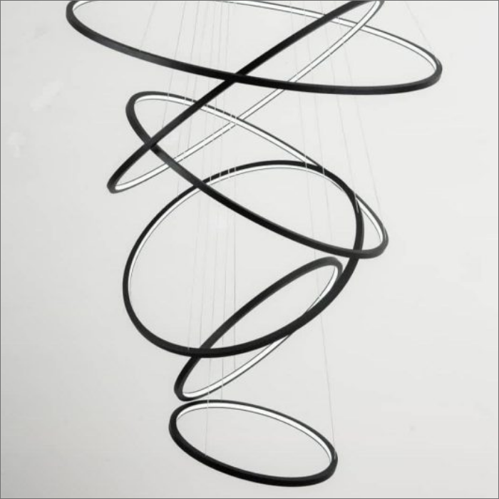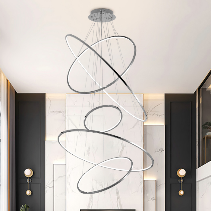 لوستر LED مدرن ، چراغ آویز خلاقانه با سیم ارتفاع قابل تنظیم یک متری، لوستر حلقه ای 200 واتی که از شش حلقه سایز سی و پنجاه و هفتاد و نود و یک متر و مجدد سی سانتی تشکیل شده است و بسیار مناسب سالن پذیرایی با سقف های بلند و راه پله میباشد، ارتفاع از سقف نیز قابل تنظیم میباشد که با تغییر ارتفاع حلقه ها مدل های متفاوتی را برای لوستر ایجاد کنیم.