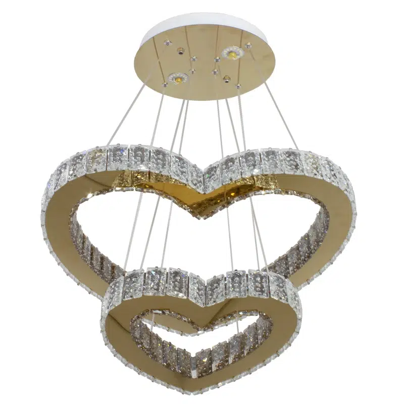لوستر مدرن سقفی طرح قلب کریستالی دو طبقه 20و40سانتی متر جذاب دارای لامپهای نواری خطی با تراکم 180 شامل ترانس ایزوله است که مانع از برق گرفتگی میشود رنگ نور سه رنگ،رنگ بدنه طلایی ریسه های اس ام دی همراه کریستال درجه یک بسیار باکیفیت ارتفاع از سقف قابل تنظیم